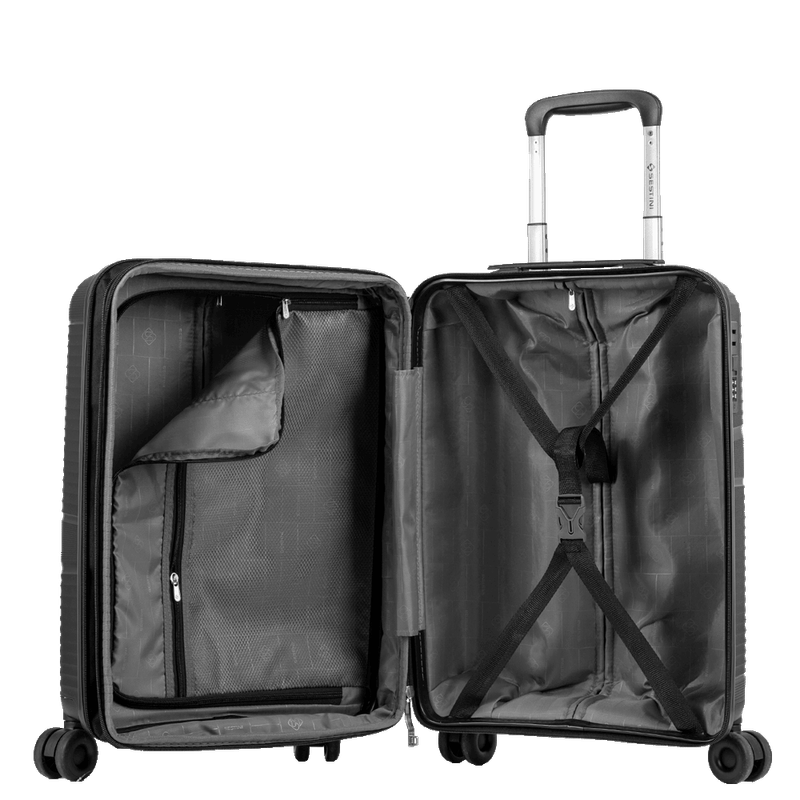 Cada mala conta com um cadeado fixo flat que proporciona segurança, além de um sistema expansível que permite aumentar a capacidade de armazenamento quando necessário. O elástico interno é perfeito para segurar as roupas, evitando que se desloquem durante o transporte.