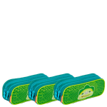 O design inclui um painel frontal em poliéster que destaca a estampa divertida, além de um logo em borracha que confere um toque especial ao produto. Este kit é ideal para crianças que buscam estilo e funcionalidade em seus acessórios escolares. Com três estojos inclusos, é uma opção prática e encantadora para o dia a dia.