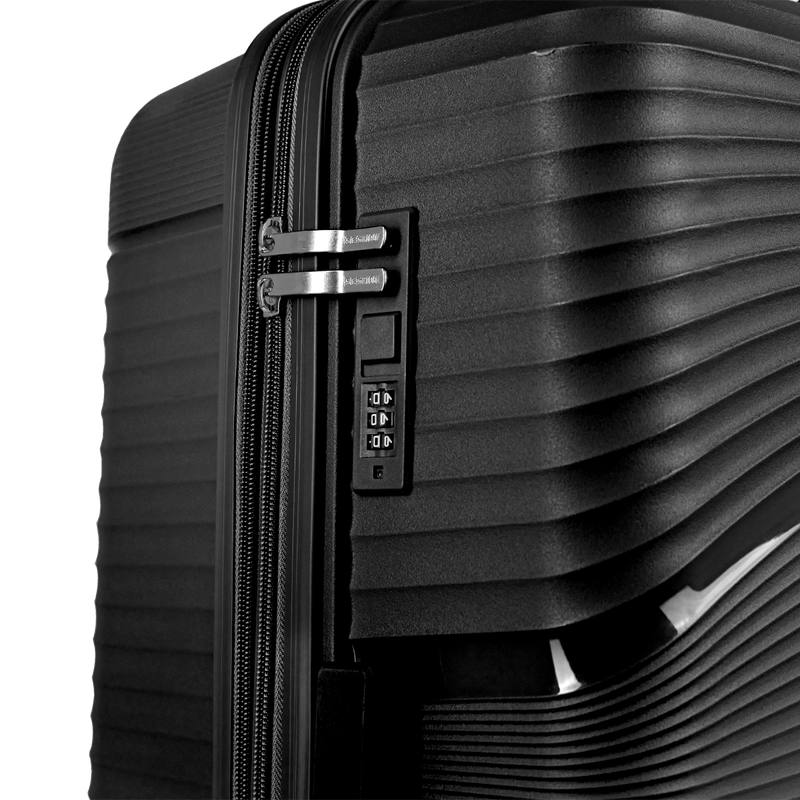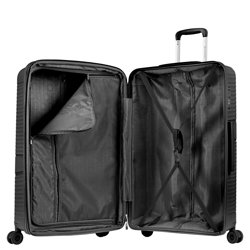 Cada mala conta com um cadeado fixo flat que proporciona segurança, além de um sistema expansível que permite aumentar a capacidade de armazenamento quando necessário. O interior é cuidadosamente projetado com um elástico para segurar as roupas, evitando que se desloquem durante o transporte.