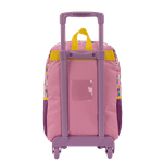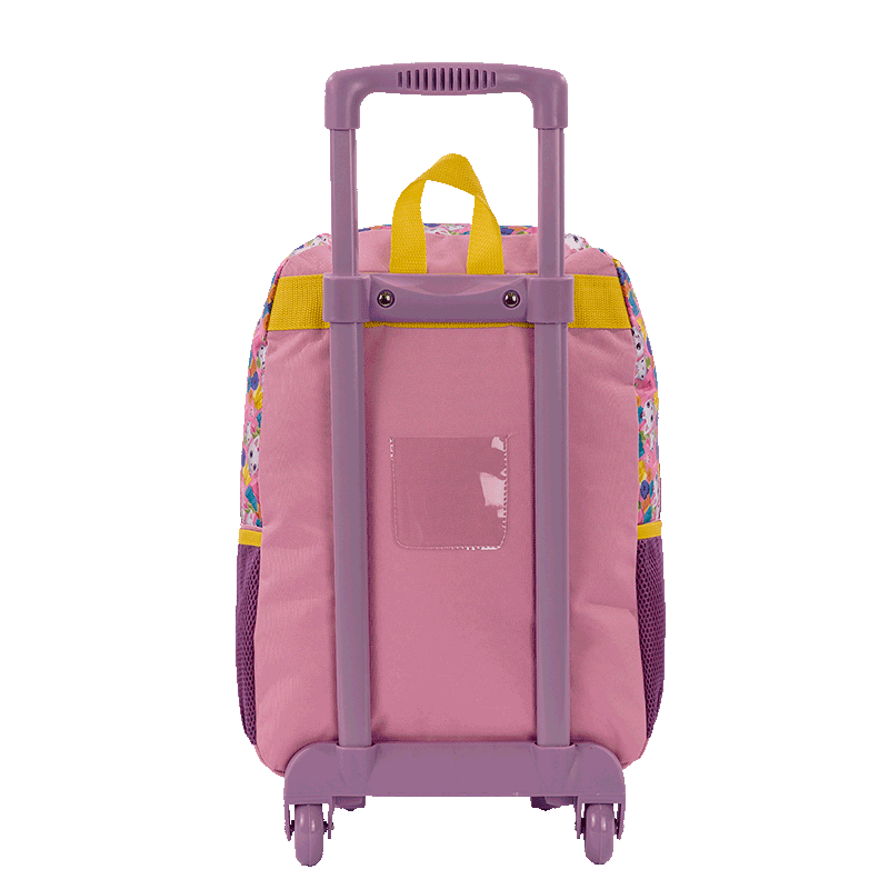 As mochilas possuem um carrinho externo com duas rodas, que facilita o transporte, embora não tenha o sistema de giro de 360 graus. O design é pensado para ser funcional, com um bolso frontal que se fecha com zíper, ideal para guardar itens de fácil acesso. Além disso, os bolsos laterais em tela com elástico oferecem espaço extra para pequenos objetos, como garrafinhas ou lanches.