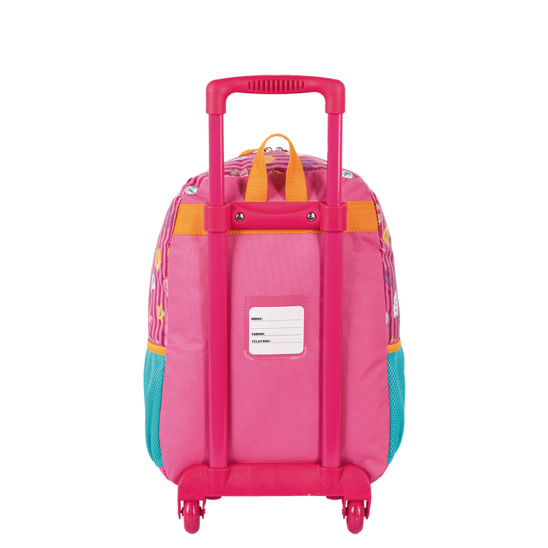 As mochilas possuem um carrinho externo com duas rodas, que facilita o transporte, embora não tenha o sistema de giro de 360 graus. O design é pensado para ser funcional, com um bolso frontal com zíper que proporciona fácil acesso a itens menores, além de bolsos laterais em tela com elástico, ideais para guardar garrafinhas ou pequenos objetos.