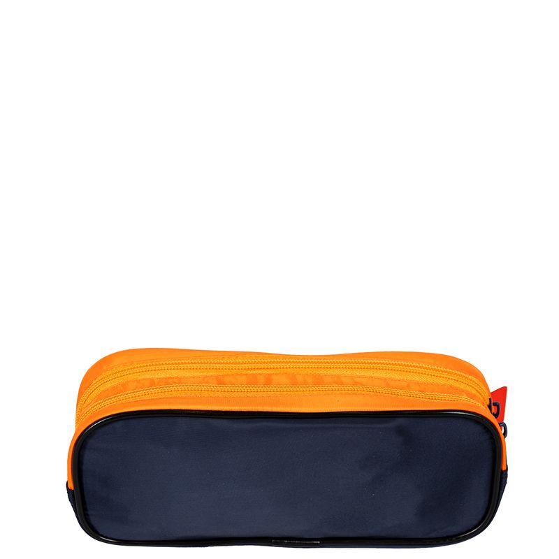 Os dois compartimentos oferecem amplo espaço para guardar canetas, lápis, borrachas e outros materiais escolares, facilitando o acesso e a organização. O logo em borracha, aplicado de forma discreta, adiciona um toque especial ao design, enquanto o painel frontal em poliéster complementa a estética do produto.