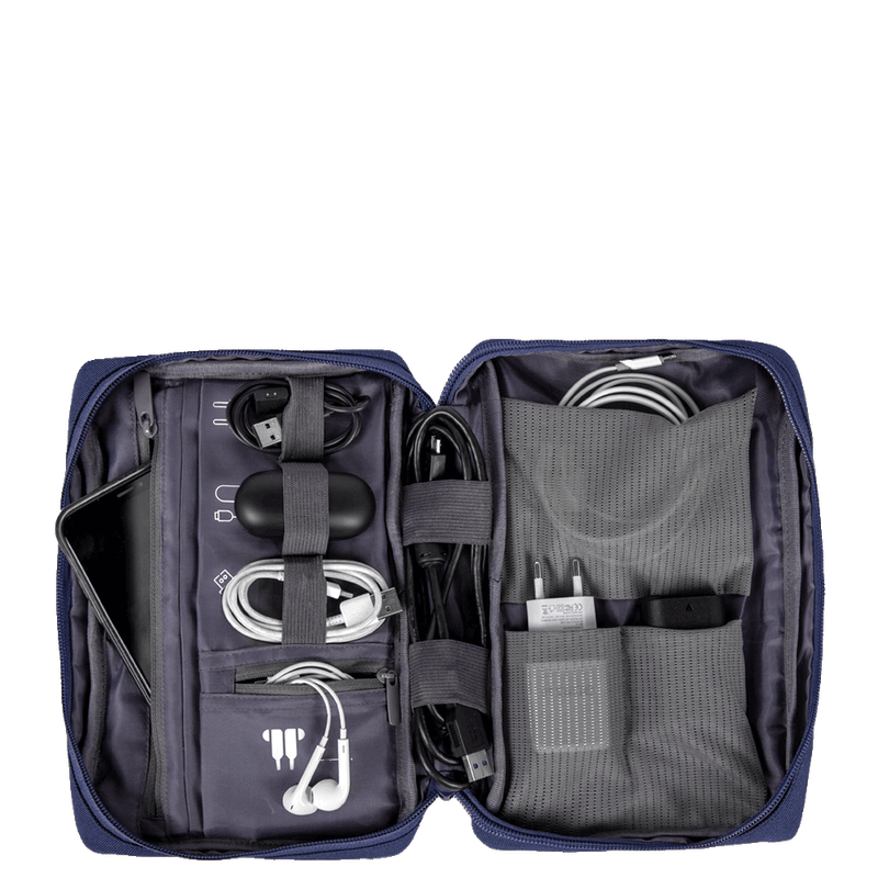 A Necessaire Organizadora de Cabos e Acessórios Eletrônicos Azul-Marinho é perfeita para manter seus itens organizados com praticidade e segurança. Feita em ABS, possui organizador interno, divisórias inteligentes, elásticos para cabos e bolso em feltro para celular, além de um bolso frontal com zíper para fácil acesso. Ideal para proteger e organizar seus acessórios eletrônicos em qualquer ocasião.